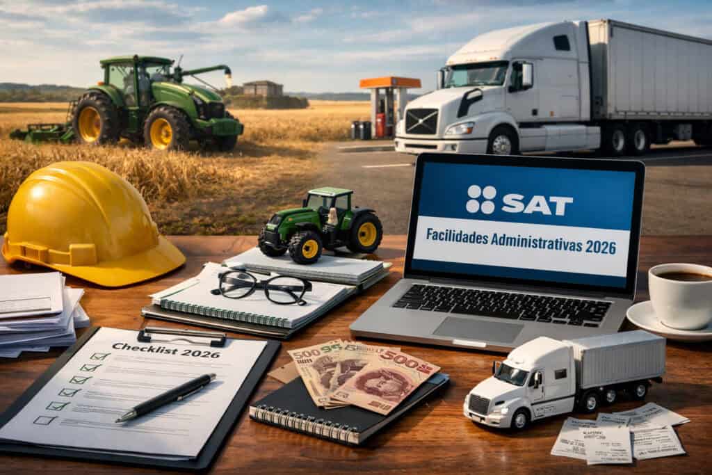 Las facilidades administrativas son reglas publicadas por el SAT para 2026 que dan opciones de comprobación y simplificación para sectores específicos, como sector primario y autotransporte (carga federal, pasaje/turismo, materiales y urbano/suburbano).